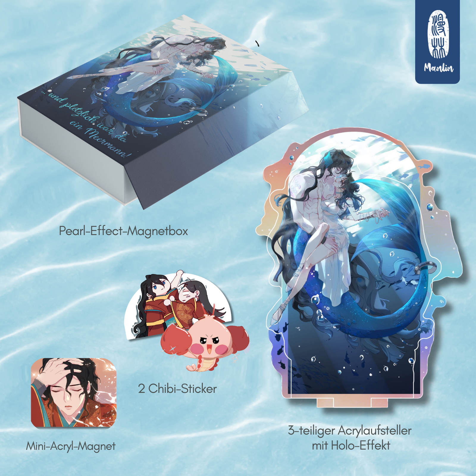 | Ausstattung | Softcover / Vollfarbe c.a. 200 Seiten / A5 / Magnetbox / Acryl-Standee mit Holo-Effelt, 2 Chibi-Sticker / Acryl-Magnet |